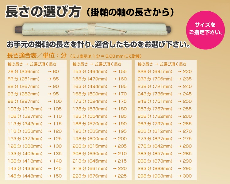 長さの選択時には、お手持ちの掛軸の軸の長さ+2分を目安にお選び下さい。(1分=3.03mm)